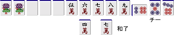 ②七萬自摸和の場合、副露20符+自摸2符+辺張2符+白・暗刻8符の計32符、切り上げ40符の役1翻和り ⇒ 荘家(親)480点、散家(子)320点 七萬を辺張自摸と取ることができる。 それによって符が増える。 四萬自摸は自摸2符が加符されるだけですので、ジャスト30符で栄和と同じ点数となります。
