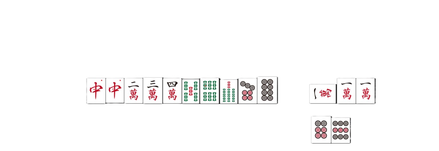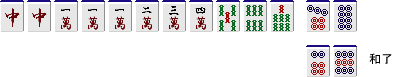 ②自摸和の場合、40符の自摸役1翻和り ⇒ 荘家(親)480点、散家(子)320点 雀頭(中)2符、暗刻(一萬)8符、自摸2符が加符されるが、摸役1翻がつき、10符減符となり、40符、役1翻で点数計算します。